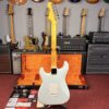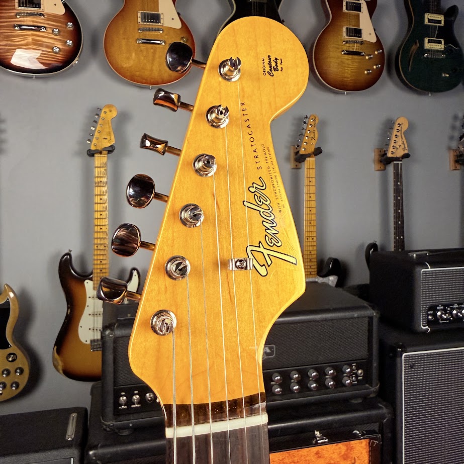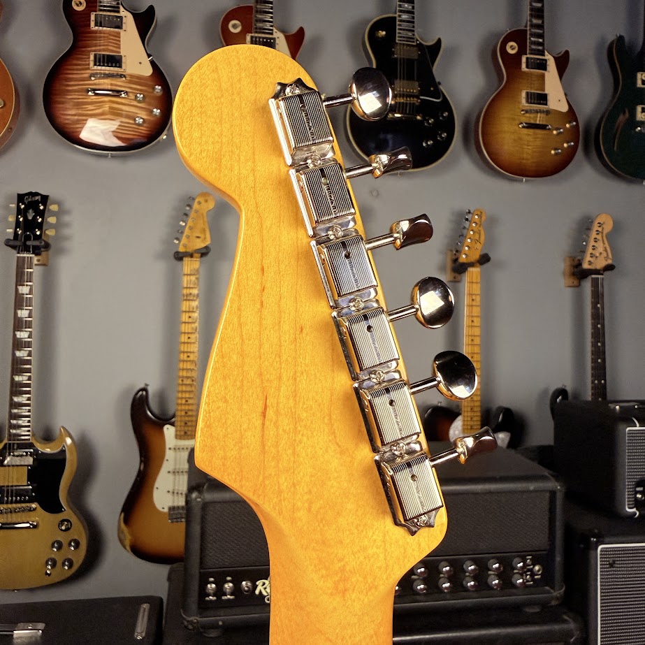 Um exemplo perfeito de uma Strat em um ano de transição, a Stratocaster de 1965 apresenta um braço de maple em formato de “С” de 1965, desta vez com uma escala de Rosewood e marcações maiores de pontos perolados.